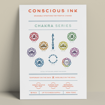 Our Chakra Variety 10-Pack is designed to focus on the 7 different centers of spiritual power in the human body. Focus on rebuilding energy from the source you need the most! (Contains 10 different Manifestation Temporary Tattoos. Individually cut. Ready to apply in seconds!)