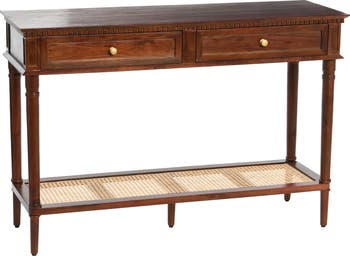 This narrow console table not only adds a touch of elegance to any living space, but it also provides ample storage to keep essentials organized and within reach. Boasting two drawers and a stunning natural cane storage shelf, this multipurpose table is perfect for displaying in and entryway or foyer to keep well-loved items close at hand, or behind a sofa to rest a beverage. The intricate details of Traditional style blend seamlessly with the natural cane shelf, which imbues a modern, contemporary aesthetic. Discover a secret hidden compartment at the back of the drawer, adding a clever and functional touch. Assembly is a breeze and requires no tools, so you can have your new table ready in minutes. Measuring 48 inches long, 16 inches wide, and 32 inches high, this coffee table is perfect for any living space.