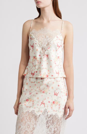 Blurred blooms romance this rich satin cami romanced by lovely floral lace.