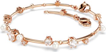 Inspired by the constellations, this luminous bracelet showcases starry Swarovski crystals and luminous Swarovski pearls floating along polished bars.