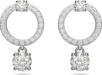 Reflect light in ever new and brilliant ways with these elegant stud earrings featuring a pavé crystal circle with a round stone hanging freely below.