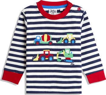 A must-have for little construction lovers, this long-sleeve top features four work trucks in colorful embroidery on a field of crisp stripes.