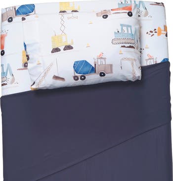 Your child will love sleeping on these soft microfiber sheets and pillowcase. The three-piece set includes one twin size flat sheet, one twin size fitted sheet, and one standard size pillowcase. The fitted sheet and pillowcase feature a variety of construction vehicles in vibrant watercolors. The fitted sheet has elastic all the way around for a secure fit. The top sheet is 66” × 96“ in navy blue with a self-border at the top.