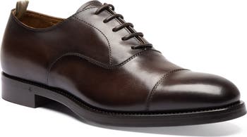 A men's Oxford shoe handcrafted in Italy from dark brown suede leather, featuring a distinguished cap toe with airbrushed patina for a refined, bespoke finish. The full leather lining and leather sole with rubber-injected support offer lasting comfort and durability, while the classic lace-up closure completes the silhouette. Runs large.