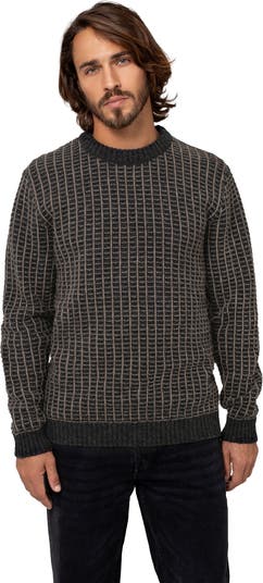 This 100% wool sweater features a crew neckline and a unique contrasting tuck and reverse stitch pattern. Ribbed cuffs, neckband, and hem ensure a comfortable fit, offering a distinctive look.