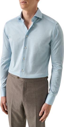This shirt combines the comfort of a knit and the polish of a dress shirt with it's exceptionally soft feel, durable construction and silky sheen. Designed in a slim fit with a wide spread collar for a modern, elevated silhouette.