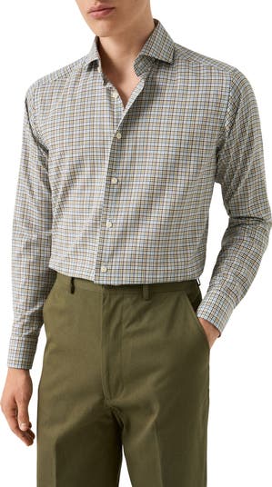 Softly brushed cotton twill patterned in a small check relaxes the formality of a dress shirt designed with a low, stay-tucked hem and styled to complement any semiformal or elevated-casual outfit. The crease-resistant finish keeps you looking crisp and smart on cooler days and busy travel.