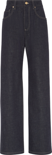 The pure cotton denim is characterized by a lightweight texture and a dark color that does not lighten after washing.
