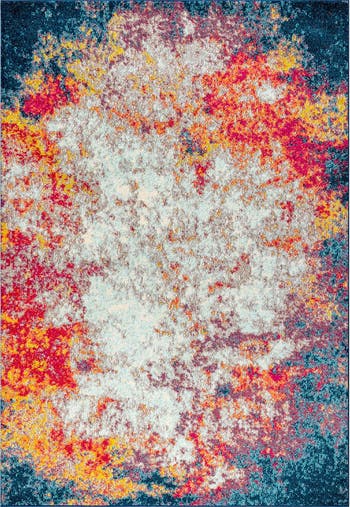 As if dabbed with an artist's brush right onto your floor, the vibrant colors and soft texture of this rug will have your guests thinking it is a real masterpiece. A contemporary composition of coral, red, gold, navy, blue, and cream, it is an accent designed to fit many color palettes. Pair with chunky textured fabrics and rattan for a boho look, or sleek minimalist furnishings for a more modern take.