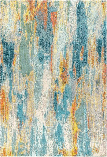If you find it hard to tell whether this rug was loomed from fiber or painted right on the floor, you're not alone. Our designers took inspiration from contemporary art and translated it for your everyday spaces, power loomed of super soft polypropylene for maximum durability. The yarns are solution dyed for maximum color saturation so this combination of aqua, turquoise, light blue, gold, and gray will stun for years to come.