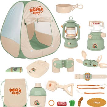 This comprehensive 20-piece indoor and outdoor camping playset features a portable pop-up play tent and a functional battery-operated toy stove with simulated glowing flame effects. Constructed from high-quality, impact-resistant materials with rounded safety edges, the kit includes essential exploration tools such as a toy oil lantern, binoculars, and a multi-functional whistle. The set is designed for interactive role-play and comes with a dedicated storage bag to organize the included play food, cookware, and safety gear accessories.