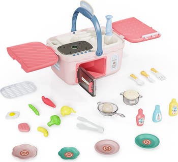 This advanced 2-in-1 interactive playset seamlessly transitions from a compact picnic carrier to a fully integrated kitchen station, featuring a synchronized grill, sink, and oven module. Manufactured from high-impact, non-toxic ABS plastic, the set utilizes specialized thermochromic "color-changing" technology for play food items—including steak, chicken, and fish—which shift pigments when placed on the active grill surface. The unit is equipped with an integrated electronic sound and light module that provides realistic haptic feedback and auditory cues during simulated cooking sequences. Designed for high-mobility use, the ergonomic folding chassis includes secure storage for all included cookware and utensils, supporting the development of fine motor precision, spatial reasoning, and social-emotional learning through complex role-play scenarios.