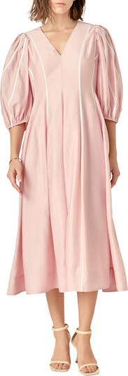 Puff shoulders and billowed sleeves sweeten the silhouette of this crisp poplin midi designed with a nipped-in waist and a drapey flared skirt.