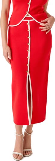 Contrast trim and polished goldtone hardware heighten the retro sophistication of this knit midi skirt.