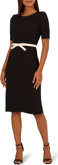 A charming contrasting waist bow sweetens the silhouette of this crepe sheath framed by abbreviated sleeves.