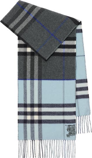 A scarf in double-faced cashmere, jacquard-woven with our Equestrian Knight Design motif and the Burberry Check in contrasting colours. Made at a Scottish mill founded in 1797, the fabric is washed in local spring water and brushed with teasels – dried flowers that are drawn along the surface of the cashmere to 'raise' the cloth, creating a natural lustre and ultra-soft finish.||Rectangular|Fringing at both ends