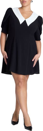 A tailored V-neck mini with an oversized collar, short sleeves, and precise seaming.
