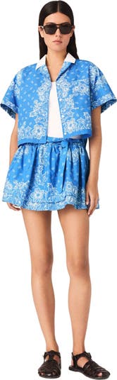 Inspired by the deep blue of the ocean, this Riviera-style shirt is a wonderfully fresh piece that combines a bold graphic style with a casual look, celebrating the Maje woman's eye for detail.This shirt features the Blue Bandana print and a short, structured cut. It's a light and feminine piece enhanced by a contrasting white collar and a chest pocket for a modern, effortless silhouette, perfect for making a style statement.Wear it with the matching short skirt, a white top layered underneath, leather sandals and sunglasses to create a chic, bright outfit.