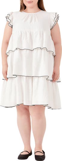 Contrasting trim enlivens this babydoll dress designed with flouncy, layered ruffles.