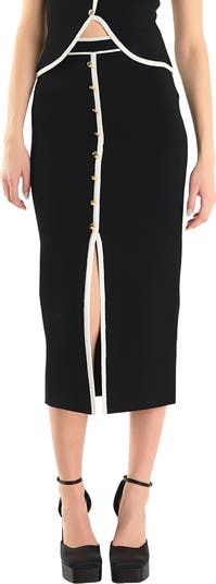 A leg-baring front slit brings easy movement to this shapely sweater-skit knit with contrasting trim and elevated with gleaming buttons.
