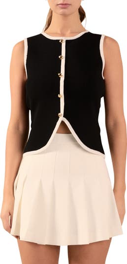 Contrasting trim outlines this soft knit vest elevated with high-shine golden buttons and punctuated with an airy vented hem.