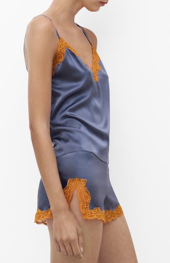 Fun, flirty style defines this stretchy silk camisole trimmed with contrast lace along the neckline.