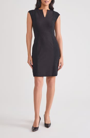 Textured and stretch-knit panels create a study in contrasts on a sleeveless sheath dress that's sure to be an office standout.