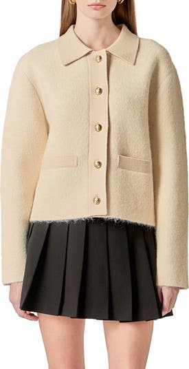 A fuzzy knit keeps you nice and cozy in this polished cardigan fashioned with textured accents and goldtone crest buttons.