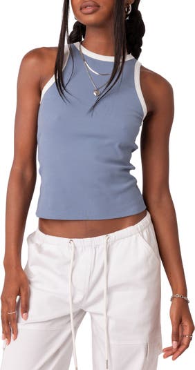 Bright-white contrast trim brings sporty appeal to this slim ribbed tank top with a trend-right high neck.