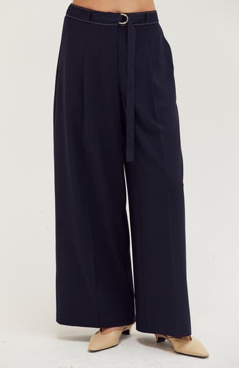 Cut in a wide leg silhouette, these high-rise trousers are finished with contrast stitching, handy side pockets, and a D-ring buckle belt for an effortless polished look.