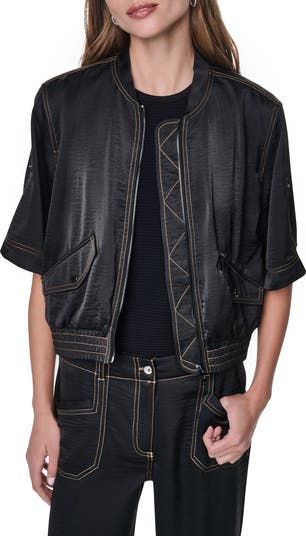 Roll-tab cuffs put a fresh, versatile spin on this sleek bomber jacket complete with contrast stitching.