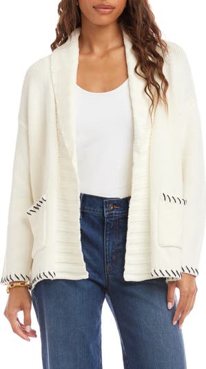 Contrast stitching lends playful charm to an open-front cardigan knit from cotton-blend yarns in a slouchy silhouette you'll love.