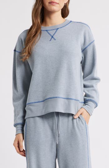 Schedule some sofa time to enjoy the comfort of this slouchy waffle-knit sweatshirt accented with contrast stitching.