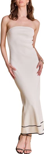 Eased with a back slit and offered with contrast stripes, this strapless knit dress makes a chic statement.