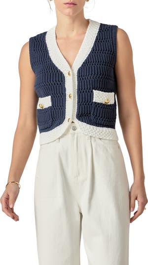 Gleaming buttons and contrast trim highlight a cropped sweater-vest knit from chunky cotton-blend yarns.