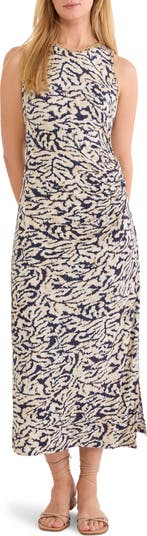An allover print energizes this figure-skimming maxi accented with neckline embroidery and a leg-baring side slit.