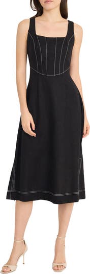 Contrast topstitching highlights the bodice and frames the skirt of a graceful A-line midi dress cut from a breathable linen blend.