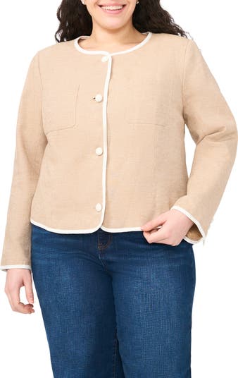 Crochet-inspired buttons bring an artisanal slant to this boxy, cropped jacket cut from an airy blend of cotton and linen. Dual patch pockets at the chest bring a sense of balanced symmetry.