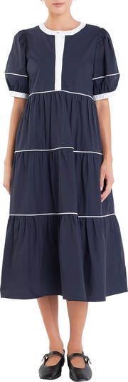 Contrast piping accentuates the tiered skirts and puff sleeves of this breezy cotton midi dress.
