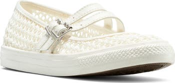 A kicked-up look with a pared-down profile, this ultralow-top sneaker stays fresh with a breathable openwork upper and a pair of slender mary jane straps. The glossy cupsole and All Star license plate keep every step grounded in heritage details and sneakerhead approval.