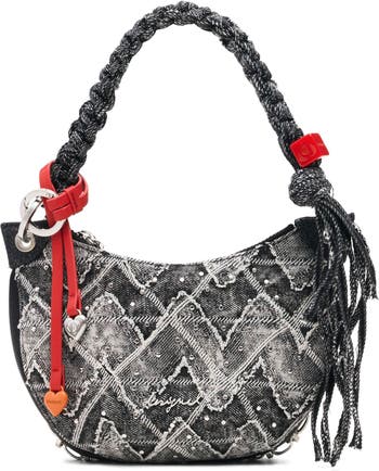 Shimmering studs highlight the pieced denim construction of this outfit-making handbag furnished with multiple carrying options.