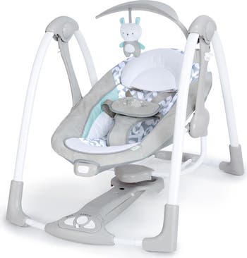 Your newborn can swing or sit in comfort with the Raylan ConvertMe Swing-2-Seat from Ingenuity. When your infant wants to sway, the automatic swing setting will calm and comfort. Quickly and easily convert it into a stationary seat with our secure EasyLock system. In either mode, baby can enjoy soothing vibrations. This travel friendly baby swing features a foldable design so it can lay flat for easy storage and portability. Soothe your little one with 5 swing settings, 12 melodies and 4 nature sounds or keep him entertained with plush bear toy included. When you need to scoop up your baby, our innovative leaf-shaped toy bar easily pivots out of the way. Power the swing motion and music with a USB cord (included), while 1 C battery powers the vibration unit. Batteries not included. When things get messy, remove the machine washable seat pad and headrest for easy cleaning. With a gender neutral design, this swing makes a great baby shower gift idea for boy or girl. This compact and take along swing-to-seat is ready for the ride wherever you need to go. Use from age 0 to 9 months or up to 20 lbs.