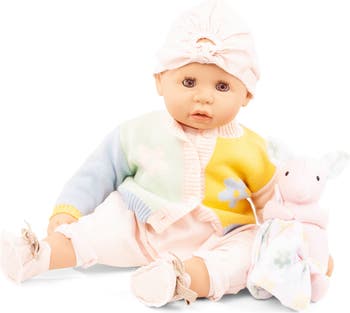 COOKIE: 19" SOFT DOLL - FABSPIEL PASTEL OUTFIT - Meet Cookie, the sweetest 19" soft doll from Gotz dressed in her Fabspiel pastel outfit! Cookie is in summer mood. She wears a finely striped jumpsuit with long sleeves, comfy fabric shoes and a really chic hat with a front knot. If it gets cold outside, the super-beautiful knitted jacket with pastel-colored flowers comes along. ENCOURAGING IMAGINATION & PLAYFUL LEARNING: If the cuddly bunny is with her, Cookies world is fine. When getting tired she sucks a little on the pacifier and falls asleep. Cookie loves cuddles, tea parties, and endless pretend play. Her soft cloth body makes her perfect for hugging, while her delicately detailed vinyl face gives her a lifelike charm. Designed for imaginative children, she’s easy to dress, pose, and carry everywhere. QUALITY MATERIALS & THOUGHTFUL DETAILS: Crafted with Gotz’s renowned European quality, Cookie encourages nurturing play that helps little ones build empathy and creativity. Whether its bedtime snuggles or daytime adventures, Cookie is always ready to be a best friend. Beautifully made to last through years of love, this charming companion makes an unforgettable gift for doll collectors and little dreamers alike! Cookie is 19'' tall and has brown sleeping eyes. SET INCLUDES: Cookie, suit, fabric shoes, headscarf, knitted jacket, pacifier, favorite cuddle toy, diaper. KEY FEATURES: Machine washable and suitable for tumble drying. Soft body with vinyl arms and legs. Suitable for children 3 years and older – due to the size and weight we recommend this doll for children from 5 years and older, due to size and weight.