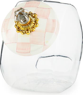 A hand-painted lid with a glass knob glamorously seals this cookie jar that reveals exactly where the goodies are.