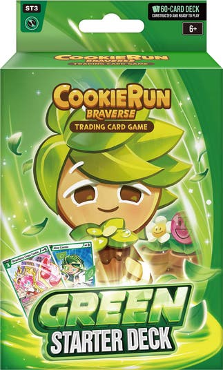 COOKIERUN TRADING CARD GAME: STARTER DECK - GREEN - The basic pack for strategic gameplay. Build up resources early and unleash a powerful late-game strategy! THERE ARE 4 TYPES OF CARDS: Cookie, Item, Trap, Stage. The Green Starter Deck excels at boosting resources and leveraging them for powerful plays. Quickly expand your Support Area, then reduce it at key moments to block attacks or land finishing blows to overwhelm your opponent. Mastering the Support Area is the key to dominating the game with the Green deck. Take turns against the opponent with various strategies. Start your journey now with the starter deck - where both strategic gameplay and exciting collection await! Exciting battle with sweet cookies, Cookierun: Braverse! COOKIERUN CARD GAME is a two-player battle card game based on the adventures of the Cookies featured in various CookieRun Games. DECK BUILDING: Compatible with other starter deck colors. Choose from 5 types of starter decks (red, yellow, green, blue, purple)! Unleash diverse strategies with the colors of your choice. In CookieRun: Braverse, you must prepare a deck consisting of 60 cards, including Cookie card, item cards, trap cards, and stage cards. When building a deck, you can use all color types. You can include up to 4 cards with the same card number. You can include up to 16 flip cards. You must includes at least one cookie card. ONE PLAYER NOTE: This product is for one player. Two players and two starter decks are required to play. INCLUDES: 1 ready-to play 60-card deck, 1 promotion card, single-player playmat, 1 rules guide.