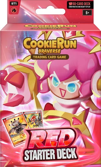 COOKIERUN TRADING CARD GAME: STARTER DECK - RED - The basic pack for aggressive game play. Prefer an aggressive playstyle that pressures your opponent? THERE ARE 4 TYPES OF CARDS: Cookie, Item, Trap, Stage. The Red Starter Deck features cards that boost damage. It includes various Items and Stages that increase attack power, allowing you to overpower your opponent from the early game. The deck contains Trap cards that can neutralize or counter enemy attacks! It’s packed with powerful cookie cards capable of dealing heavy damage to the opponent’s Battle Area. Ideal for players who like to strike fast, hard, and without hesitation to dominate the game. Stake turns against the opponent with various strategies. Start your journey now with the starter deck - where both strategic gameplay and exciting collection await! Exciting battle with sweet cookies, Cookierun: Braverse! COOKIERUN CARD GAME is a two-player battle card game based on the adventures of the Cookies featured in various CookieRun Games. DECK BUILDING: Compatible with other starter deck colors. Choose from 5 types of starter decks (red, yellow, green, blue, purple)! Unleash diverse strategies with the colors of your choice. In CookieRun: Braverse, you must prepare a deck consisting of 60 cards, including Cookie card, item cards, trap cards, and stage cards. When building a deck, you can use all color types. You can include up to 4 cards with the same card number. You can include up to 16 flip cards. You must includes at least one cookie card. ONE PLAYER NOTE: This product is for one player. Two players and two starter decks are required to play. INCLUDES: 1 ready-to play 60-card deck, 1 promotion card, single-player playmat, 1 rules guide.