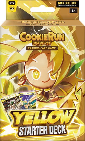 COOKIERUN TRADING CARD GAME: STARTER DECK - YELLOW - The basic back for defensive game play. A deck that grows stronger as more cookies stack in the Break Area! THERE ARE 4 TYPES OF CARDS: Cookie, Item, Trap, Stage. The Yellow Starter Deck uses unique tactics to manipulate the Break Area, turning unfavorable situations into opportunities. Some cards activate when a certain level is reached in the Break Area, rewarding players who take calculated risks and aim for a comeback. The core strategy is combining low-level cookies with cards that reduce Break Area levels. It also includes Trap cards that can neutralize or counter opponent attacks. This is not the end — it’s where your real strategy begins. Take turns against the opponent with various strategies. Start your journey now with the starter deck - where both strategic gameplay and exciting collection await! Exciting battle with sweet cookies, Cookierun: Braverse! COOKIERUN CARD GAME is a two-player battle card game based on the adventures of the Cookies featured in various CookieRun Games. DECK BUILDING: Compatible with other starter deck colors. Choose from 5 types of starter decks (red, yellow, green, blue, purple)! Unleash diverse strategies with the colors of your choice. In CookieRun: Braverse, you must prepare a deck consisting of 60 cards, including Cookie card, item cards, trap cards, and stage cards. When building a deck, you can use all color types. You can include up to 4 cards with the same card number. You can include up to 16 flip cards. You must includes at least one cookie card. ONE PLAYER NOTE: This product is for one player. Two players and two starter decks are required to play. INCLUDES: 1 ready-to play 60-card deck, 1 promotion card, single-player playmat, 1 rules guide.