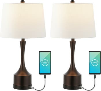 - Includes a linen-look hardback empirical shade and USB charging port for mobile devices