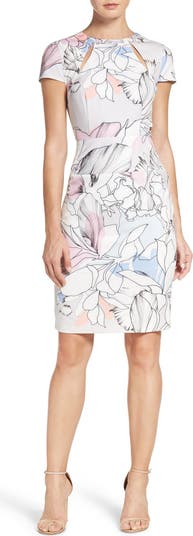 Sweet meets saucy in this pastel-printed dress made edgy with collarbone cutouts.