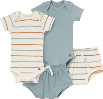 Let your baby girl enjoy sunny day adventures in style with this adorable modern moments™ outfit set. The bodysuits feature convenient leg snaps and a lap shoulder neckline for easy changes, while the shorts are designed with a comfort-stretch waistband and grippers for a secure fit. Vertical ribbing gives both the bodysuits and shorts a chic, textured look, and the faux drawstring detail on the shorts adds a playful, modern twist. It’s the perfect set for warm-weather playtime! Our essentials have been independently certified with STANDARD 100 by OEKO-TEX® so that you don’t have to worry about harmful substances in your baby’s wardrobe. Pack includes two bodysuits with two matching shorts.